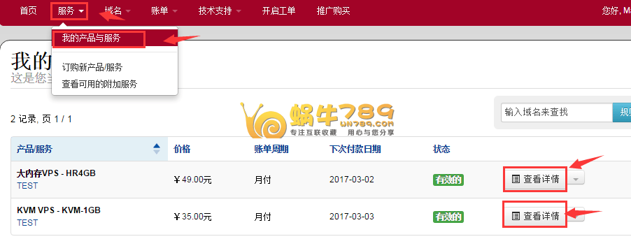 1、购买的VPS开通后,你的注册邮箱会收到开通邮件,我们登录IdcBuster官网。在服务栏点击“我的产品与服务”,然后在自己要管理的VPS后点击“查看详情”。