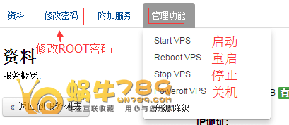 2、在管理页面可以修改ROOT密码及对VPS进行启动、关机、重启操作。