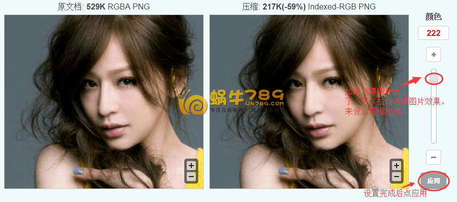 3、如果觉得系统自动压缩的比例不符合心意,可以在图片对比栏“拉动滚动条”来设置压缩图片效果,达到自己可以接受的图片大小。滚动条拉到合适位置后,记得点击“应用”,否则你点“合并”下载的图片效果是系统默认的,不是自己设置的效果。(注意:下图人物图片来自百度图片搜索,如有异议,请及时联系删除。)