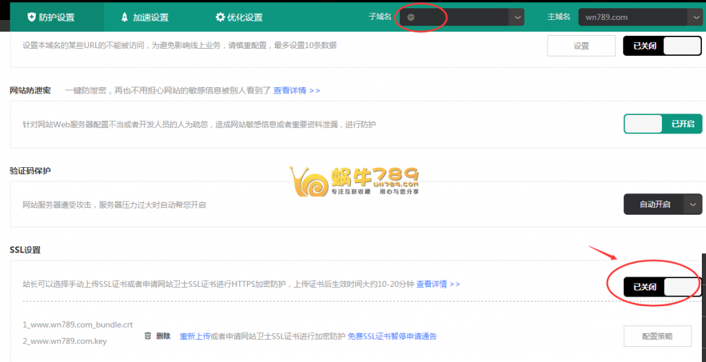 3、解决办法:找到原因后,解决办法很简单,到360网站卫士域名控制面板关闭子域名“@.wn789.com”的https加速即可。关闭后,直接访问wn789.com不再跳转到https://wn789.com连接。