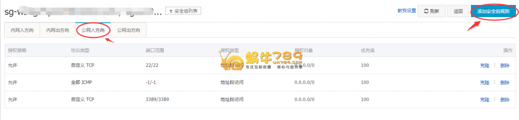3、点击“公网入方向”,然后在点“添加安全组规则”