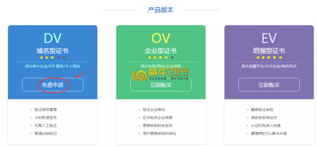 1、点击这里进入西部数码SSL证书服务页面。找到如下图位置,点击“免费申请”登陆自己的账号进入到SSL证书购买页面。
