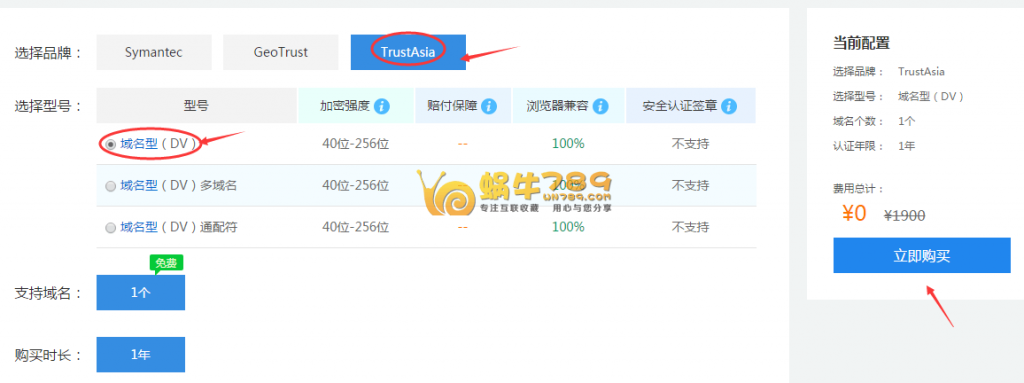2、然后选择“TrustAsia”的“域名型(DV)”,点击“立即购买”进入到支付确认页面,请点击“立即支付”完成购买。