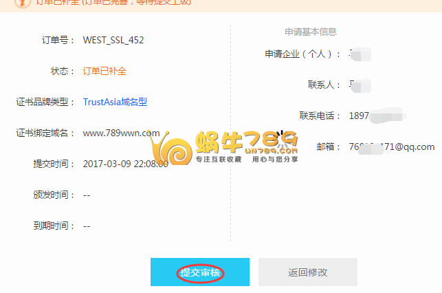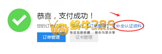 3、支付完成后,点击“补全认证资料”。补全申请域名和个人信息资料。