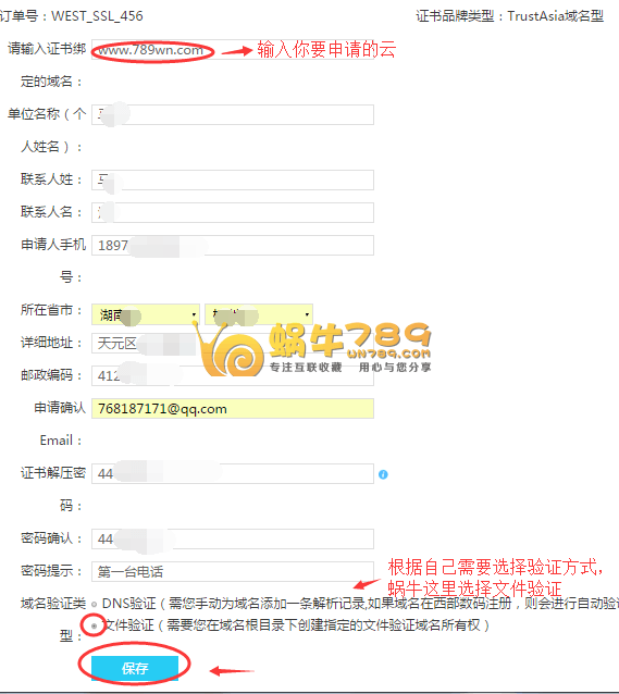 4、补全申请域名和个人信息资料。关于域名认证,可以选择DNS和文件验证。建议选择“文件验证”,因为DNS认证需是在西部数码购买的域名或使用西部数码DNS服务器的朋友才可以完成验证。