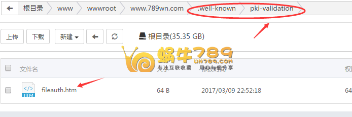8、在你的站点根目录创建一个“/.well-known/pki-validation/”文件夹,并不fileauth.htm上传到/.well-known/pki-validation/fileauth.htm中。