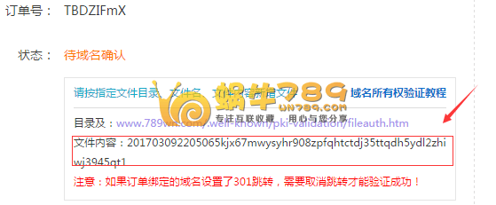 6、提交审核后,提示需要完成域名所有认证。蜗牛选择的是文件验证,需要制作一个fileauth.htm文件,并包含下图红框位置内容,然后在你网站的根目录创建“/.well-known/pki-validation/”文件夹,并上传fileauth.htm到/.well-known/pki-validation/fileauth.htm。