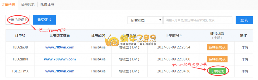 9、证书内容获取或证书下载。如果域名完成审核会在订单列表显示“订单完成”。我们点击“详情”可以查看和下载证书。