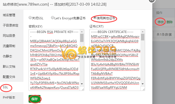 11、SSL证书部署。以宝塔web控制面板为例,填写证书内容即可完成SSL部署。