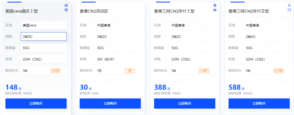 | 香港三网CN2 | 2核 | 4G | 50G | 20M | 588元/年 | 点击购买 |