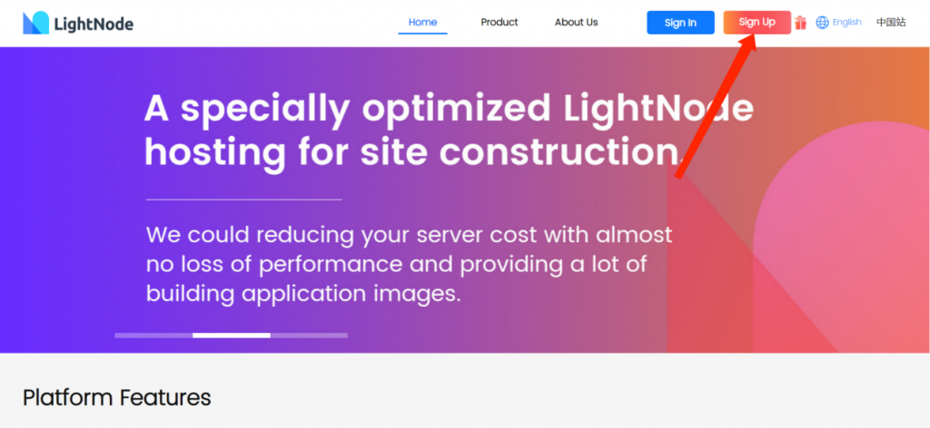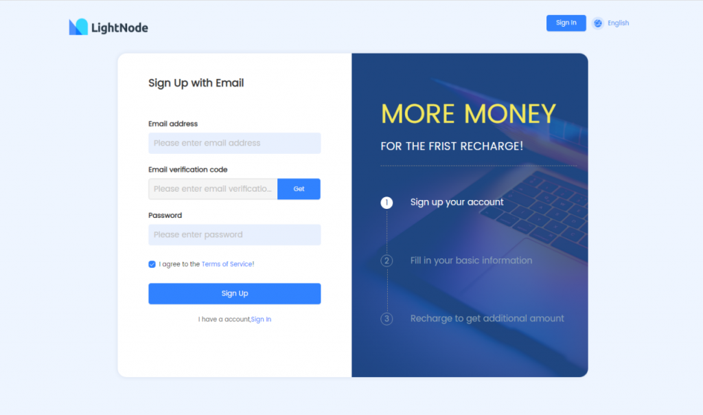 - 首先打开LightNode官网lightnode.com,点击右上角sign up注册一个账号。