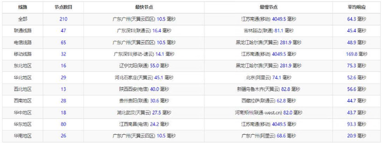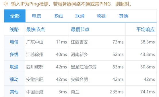 我们使用的网上的第三方工具测试全国各地Ping的情况,可以看到电信和联通都延迟都在50ms以内。移动网络应该是这个测试节点有问题的,我本地移动网络延迟也在60ms左右。所以整体来看三网Ping的延迟都还是不错的。