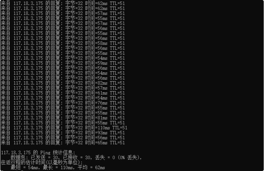 可以看到我本地Ping的平均延迟在62ms左右,网络还是非常稳定的,基本都没有丢包的情况。