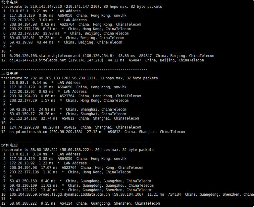 下面我们将测试下电信、联通和移动网络去程和回程路由。