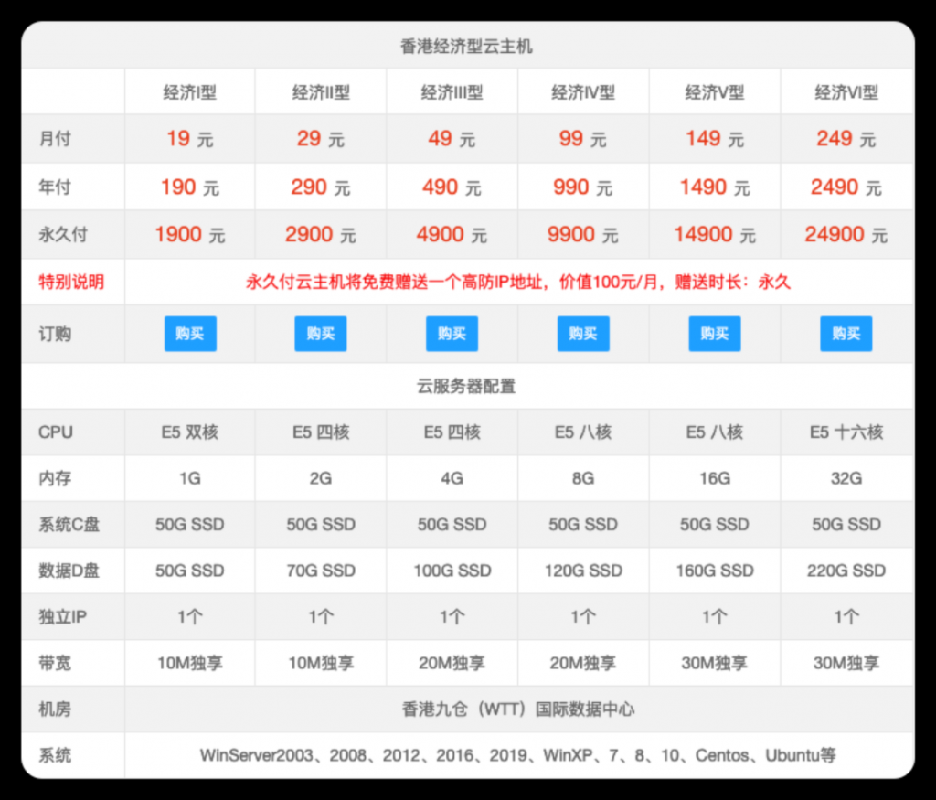 特别说明:经济型年付将免费赠送一个高防IP地址,价值100元/月,赠送时长:买几年送几年,绝无二次收费。