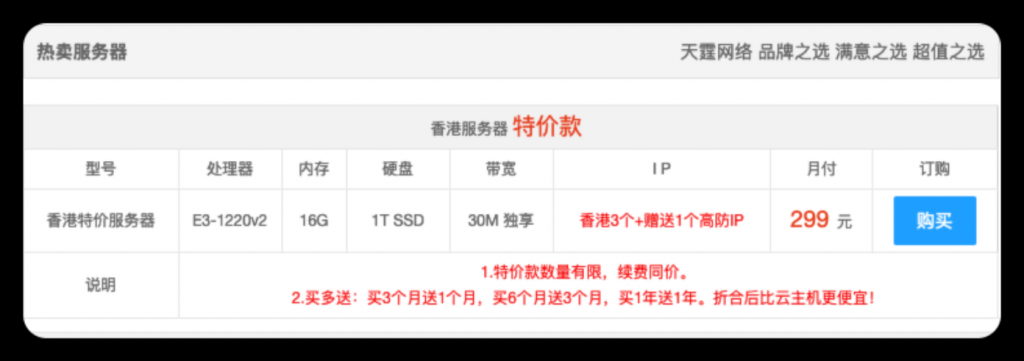 | E3 | 16GB | 1000GB | 30M独享 | 3个+1个高防IP | 299元/月 | 2990元2年 | 链接 |
