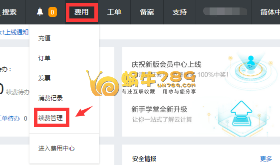 1、登录阿里云账号进入控制台,然后在导航栏“费用”中点击“续费管理”进入到续费产品列表。