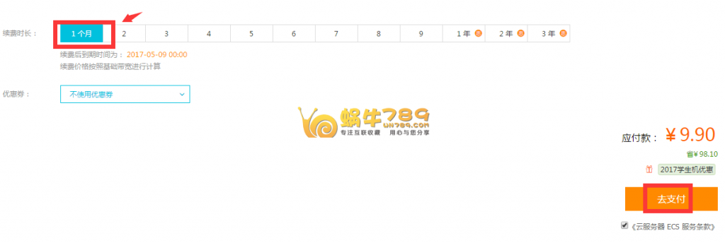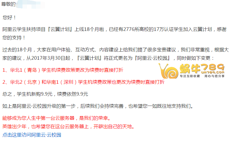 其实这个通知是在今天下午收到的,蜗牛因为前段时间购买了华南1(深圳)阿里云学生机,所以一直比较关注续费政策,几乎每天都在查看,在今天上午就发现可以9.9元/月续费了,而且不是需要等到服务器快到期才能续费,可以以月为周期无限给自己的服务器续费(当然最长续费时间是我们的在校时间)。