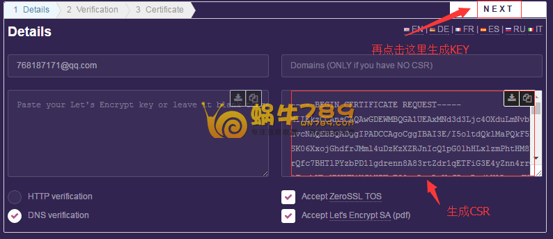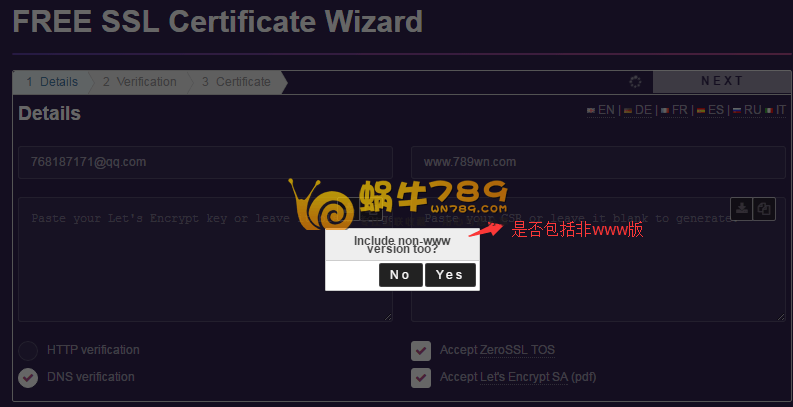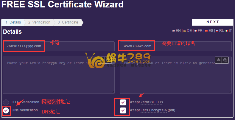1、填写邮箱及你要申请免费SSL证书的域名,及选择验证方式和服务协议。蜗牛推荐选择DNS验证。然后点击“NEXT”进入下一步。