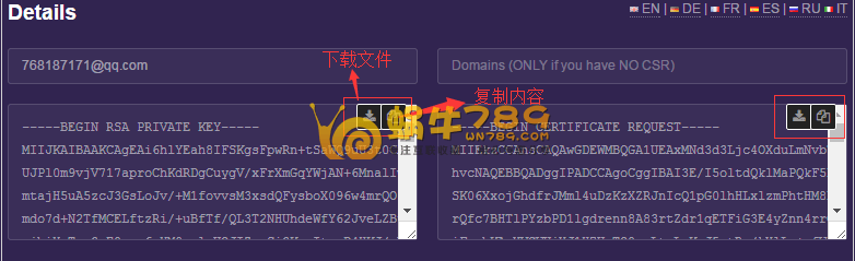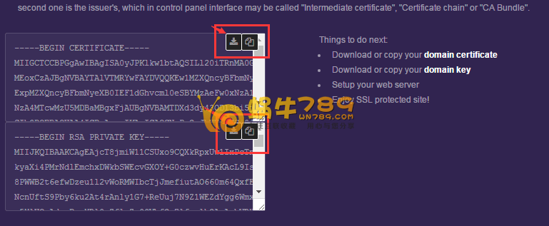 6、完成域名验证后点击“NEXT”继续进入到下图页面。表是申请成功。请下载保存好证书的CSR和KEY。