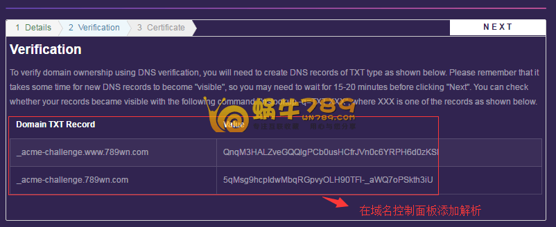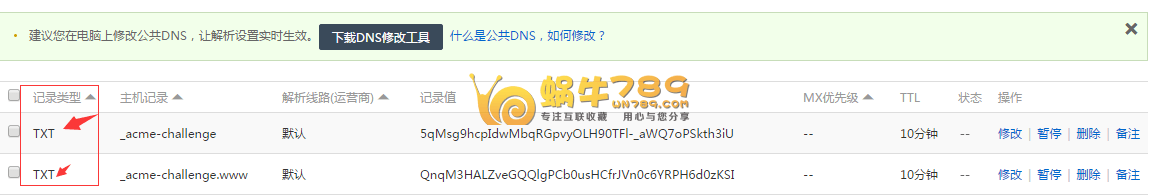 5、获取到了域名验证的记录值,请到域名解析页面,做TXT解析到下面地址。