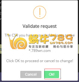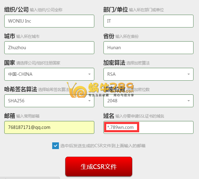 1、要通过AlphaSSL申请泛域名免费SSL证书,需要先生成和获取CSR文件。这里蜗牛建议使用“CSR文件在线生成工具”生成,。在申请页面根据我们实际的信息填写,有两处需要认真一点,一处是邮箱用来接收CSR的,不要乱写,其次是域名部分,如果我们需要得到泛解析/通配符的SSL证书,就写成类似"*.wn789.com"这样的域名。生成的CSR和KEY请保存好,因为在申请SSL证书时需要填写CSR。在安装SSL证书时需要用到KEY。