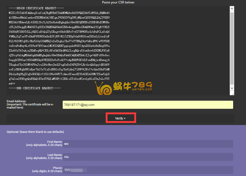 2、,填写上面获取的CSR内容到下图框内,然后填写姓、名、电话。点击“Verify”开始申请验证。