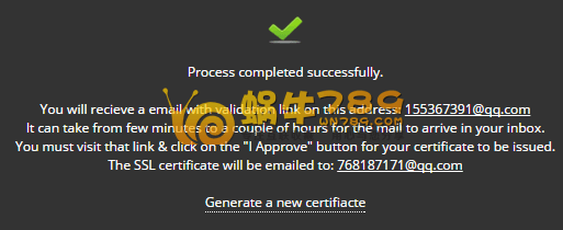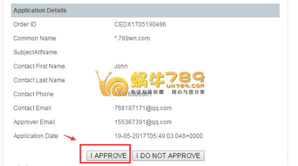 5、点击上图验证地址后,进入到确认信息页面,我们确认信息没有错误,点击“I APPROVE”完成证书申请。