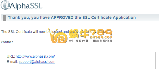 6、显示如下页面,表是申请成功,等待系统把证书内容发至你的申请邮箱。这个申请邮箱指的是你在AlphaSSL申请时填写的邮箱。