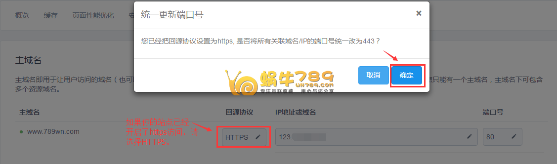 2、源站设定。添加域名后会调整到源站设定页面。如果你的站点已经开启https访问,请把http改成“https”并把端口修改为443.