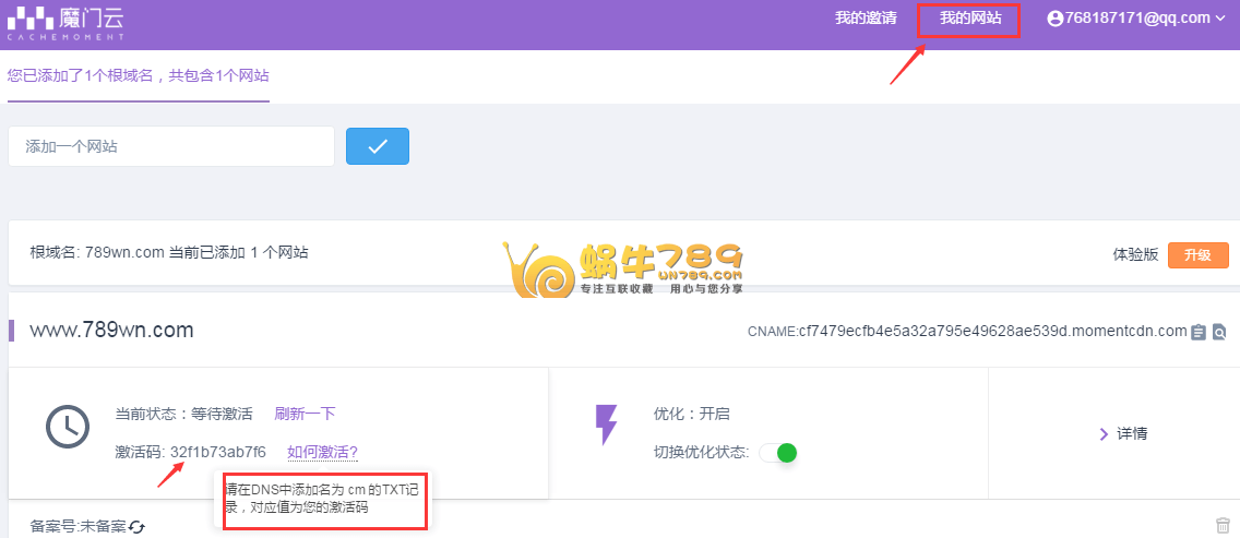 3、激活域名。源站设定完成后,点击“我的网站”进入到网站管理页面。首先我们查看如何激活域名,然后按规定设置,并完成激活。
