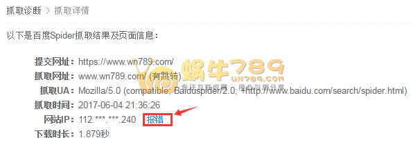 这里我们可以通过百度站长工具里面的诊断抓取来告诉搜索引擎,我们的网站更换了IP,输入网页之后,点击抓取然后过一会就会显示抓取成功。然后我们点击抓取成功的链接,会有进入到详细抓取信息显示页面,可以看到网站IP那里有个报错的按钮,我们如果换了ip就点击报错。