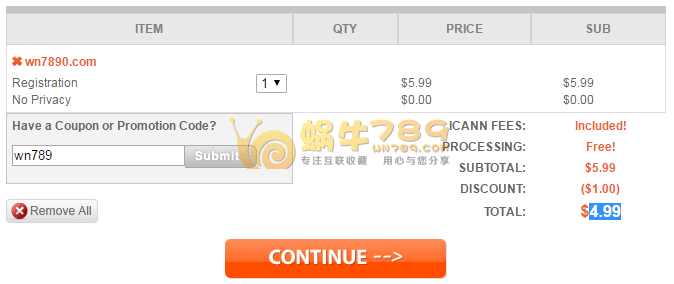 下面说下NameSilo最近的优惠政策,目前新注册.com只需5.99美元,如果是新用户第一次购可以使用蜗牛的专有优惠码“wn789、wn789com 、free123 、freewn789 、wn789free”在5.99美元基础上再减少1美元,只需4.99美元,相当于33元左右,并支持支付宝付款,并且送永久WHOIS隐私保护。