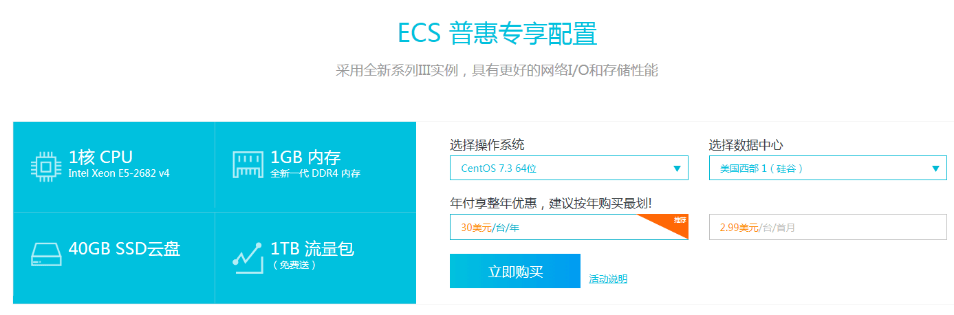 30美元/年(折合人民币只需要200元/年)!拥有美国西部硅谷、美国东部弗吉尼亚、澳大利亚悉尼、德国法兰克福四大机房供选择,是不是挺划算?刚好需要国外服务器的,不妨试试阿里云国际版,比国外一些不知名商家要有保障多了。但是注册阿里云国际版帐号需要注意的是要有Paypal和美国手机号码验证,如果需要注册阿里云国际版帐号请查看下面教程。