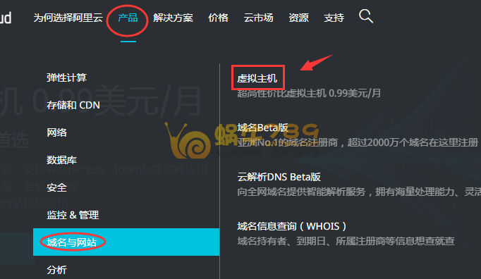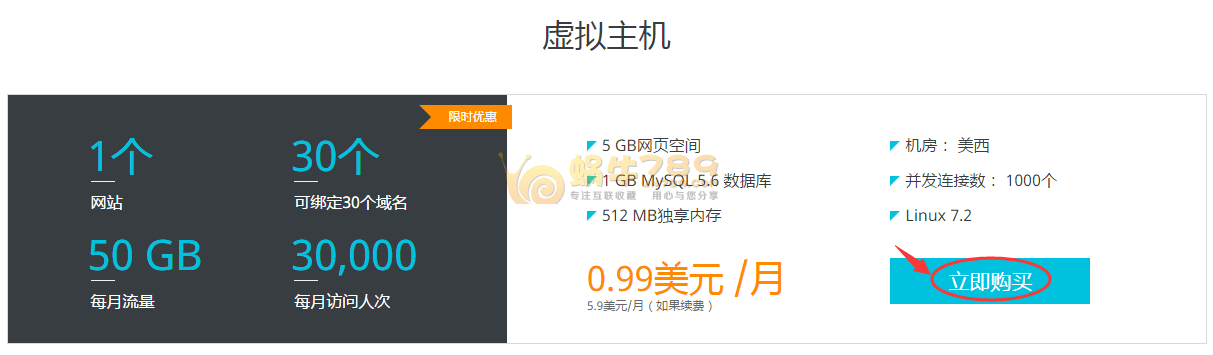 1、没有账号的朋友请先参照上面教程注册账号。然后按下图所示进入到虚拟主机购买页面。