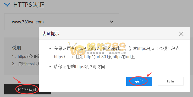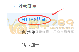 2、选择你要认证的站点,点击“HTTPS认证”提交验证申请。当然你要提交申请前必须全站开启https访问,并且原http访问链接自动跳转到https上。