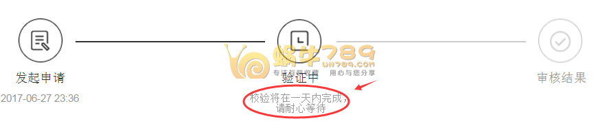 3、提交验证申请后,进入如下图页面,等待验证完成,验证审核比较快,蜗牛提交的申请不到5分钟就审核通过了。