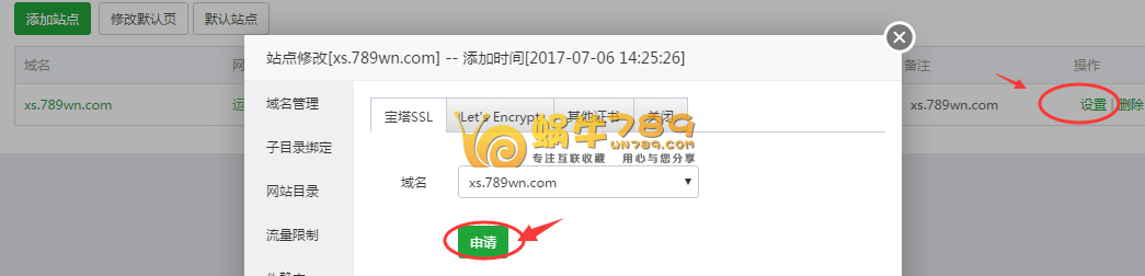 1、宝塔Linux面板一键申请部署免费TrustAsia DV SSL - G5 证书。 如果你使用的是宝塔Linux面板,那么申请部署TrustAsia DV SSL - G5 证书就简单多了,只需在“网站管理”页面点击你要申请证书的域名后的“设置”,然后选择“宝塔SSL”,选择要申请的域名,点击“申请”即可完全一键申请和部署。