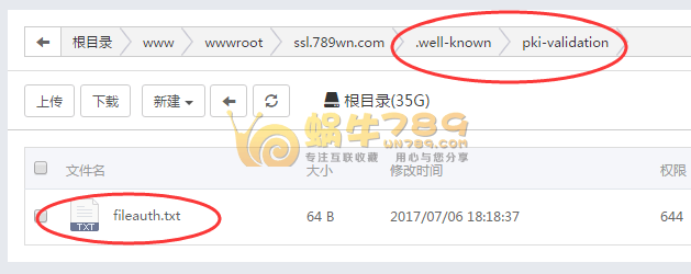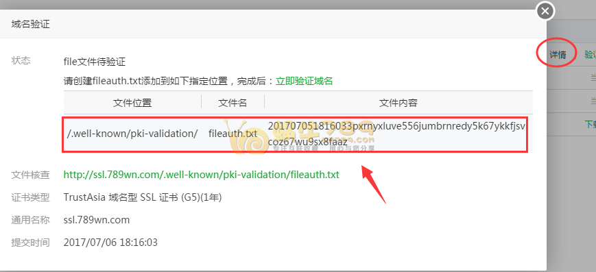 无论你选择DNS验证还是文件验证,提交后需要点击右侧“详情”查看如何验证。文件验证需要创建一个fileauth.txt文件,并上传到站点根目录创建“.well-known”文件夹,然后再在.well-known文件夹中创建“pki-validation”文件夹。并把“fileauth.txt”文件上传到“/.well-known/pki-validation”目录内。