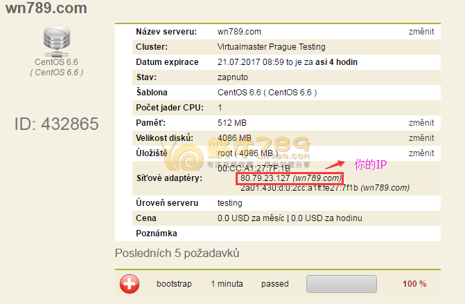 3、VPS创建成功后显示如下图,红框位置是你的IP。