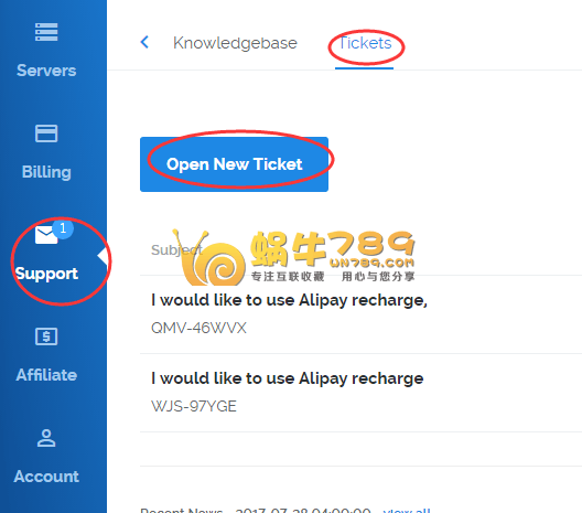 然后提交工单,内容根据自己要求写就是了,不会英文,就使用翻译软件,下面蜗牛写的是“I would like to use Alipay recharge, please add Alipay recharge button in https://my.vultr.com/billing/”大致意思“我需要支付宝充值接口,请在充值页面添加支付宝充值按钮”。