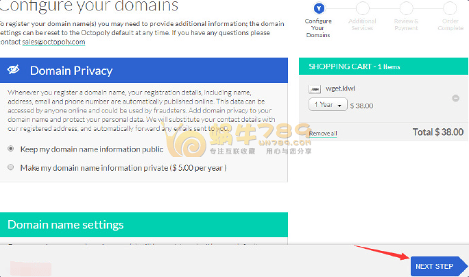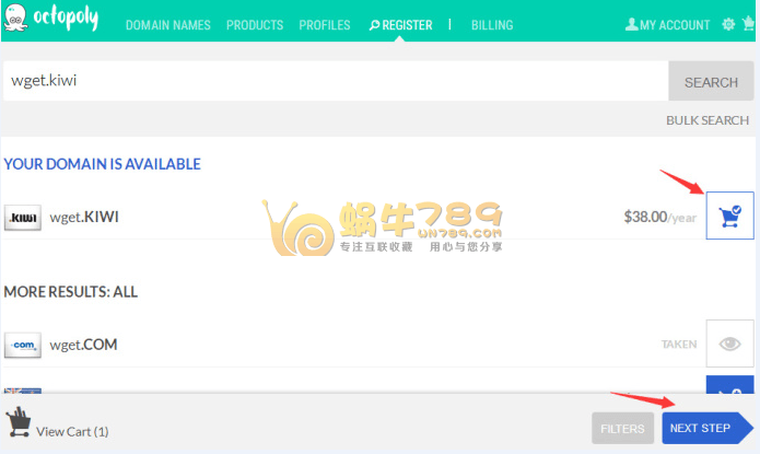 1、打开上面的活动地址,然后输入你要注册的域名。如果你要注册的域名没有被注册会显示38美元/年,然后请点击购物车图标添加到购物车,再点击“NEXT STEP”继续。