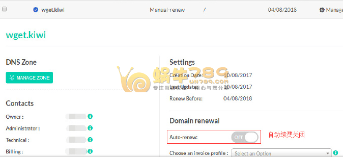 5、完成购买后,会收到邮件确认注册成功。这时我们可以登录管理面板,把域名的自动续费取消掉。
