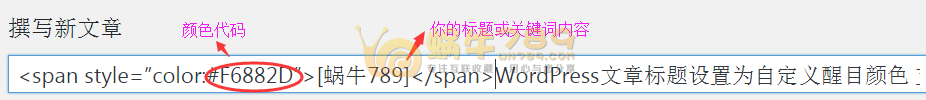1、方法原来很简单,就是为你的标题文章加上一个颜色代码。<span style=”color:#F6882D”>[蜗牛789]</span>