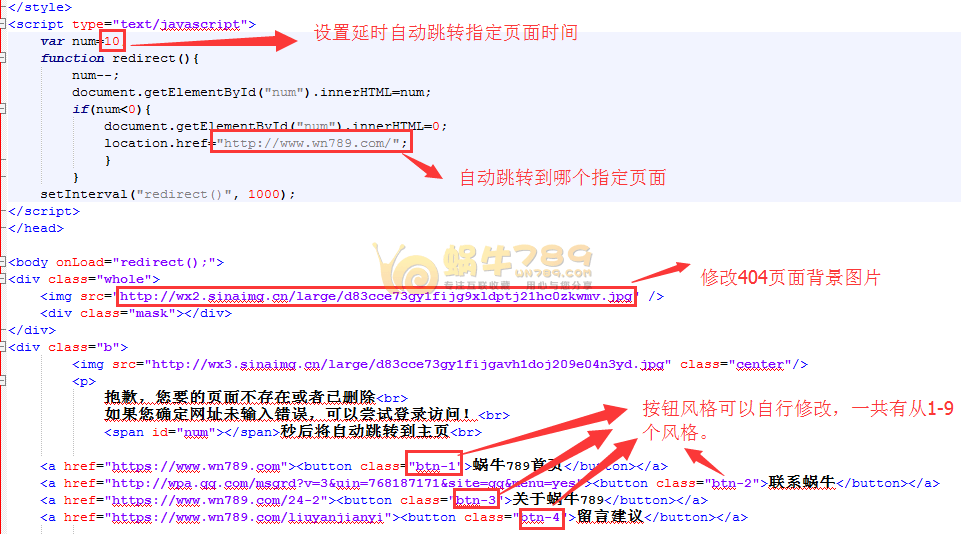 可以自定义修改延时跳转指定页面时间、自定义跳转到指定页面、自定义404页面背景图片、修改按钮风格。其他汉字部分可以根据自己需要进行修改。