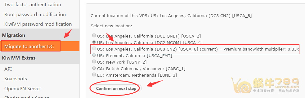 3、如何切换到CN2线路。请点击这里查看高品质美国CN2VPS管理教程,进入VPS控制面板,然后进行机房切换选择CN2。