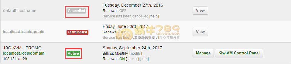 到期当天自动生成续费订单,生成订单后,如果账号有余额,系统会自动扣费进行续费;如果账号余额不足,到期的VPS在7天内可以继续使用,所以只需7天内完成账单支付就可以了;如果超过7天VPS会被暂定(不是被删除),由“Active”状态变为“Suspended”状态,但依然可以进行续费,只要完成续费就能正常使用;如果VPS显示取消“ Cancelled”状态,就不能进行续费操作了。1、下图显示的是“Active”和“ Cancelled”状态。“Suspended”状态的产品蜗牛手头暂时没有。