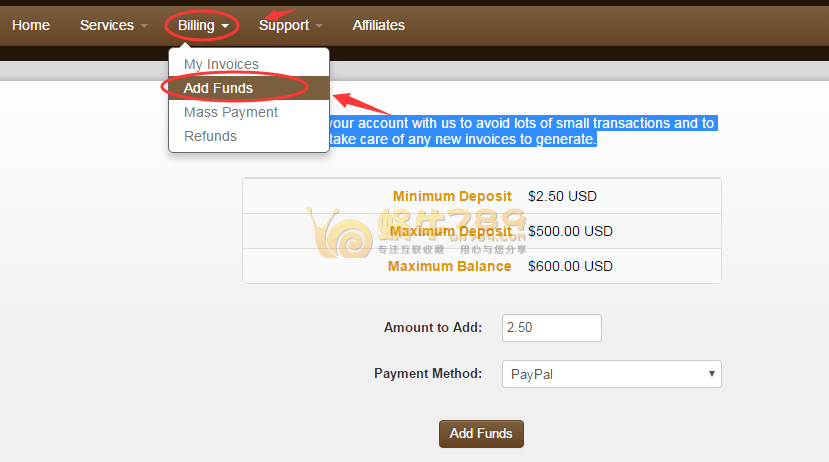 2、如果实在担心自己产品到期后,没有及时续费而造成损失的话,等到VPS使用期限快到时,往账号里充值点金额就可以了。如何给自己高品质美国CN2账号充值,可以查看下图。充值方式支持PayPal、支付宝。