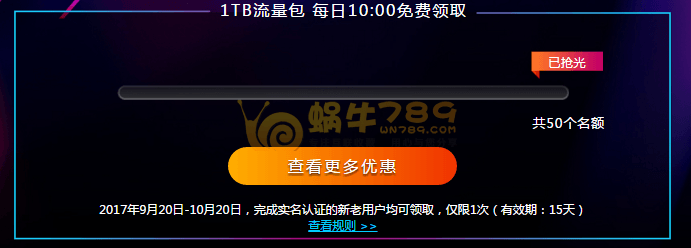 一、1T流量包每日10点免费领取,每日限量只有50个名额。活动截止日期是2017.9.20-2017.10.20。免费领取的流量包使用期限是15天。